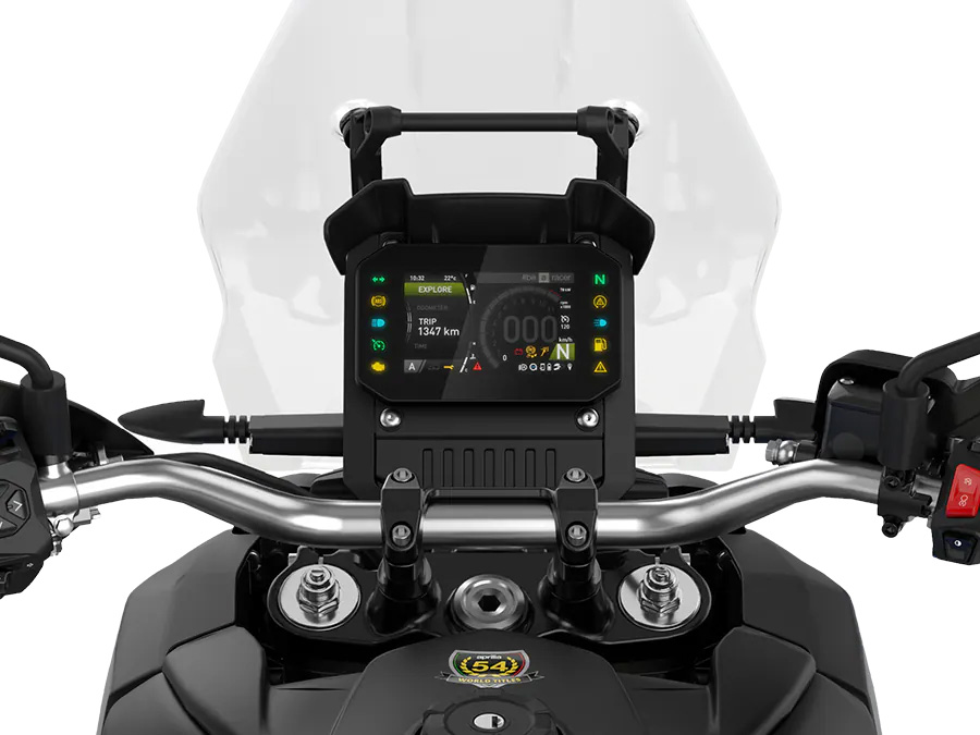Cada parámetro está bajo control gracias a la intuitiva pantalla TFT de 5”, que ajusta automáticamente el brillo al entorno. La integración con el accesorio Aprilia MIA transforma la pantalla en un auténtico centro de conectividad, con navegación, llamadas y música siempre a mano, sin distracciones de la conducción.