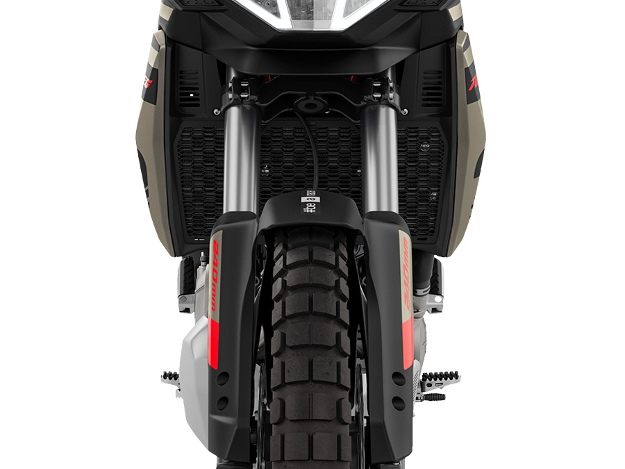 Horquilla de 43 mm de diámetro y monoamortiguador con bieletas progresivas, ambos de largo recorrido y multiajustables: 240 mm de recorrido para ambos, para encontrar tracción y diversión off-road, sin comprometer la absoluta precisión sobre asfalto del chasis Aprilia.